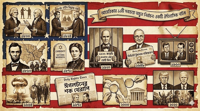 আমেরিকার প্রেসিডেন্ট নির্বাচন মানেই পুরো বিশ্বের নজর আটকে থাকা এক মহাযজ্ঞ। আমরা সাধারণত ভাবি যে মানুষ ভোট দেবে আর যার ভোট বেশি সেই জয়ী হবে। কিন্তু আমেরিকার আড়াইশ বছরের ইতিহাসে এমন কিছু নির্বাচন হয়েছে যা সাধারণ যুক্তি বা বুদ্ধির বাইরে। কোথাও জেতার পর প্রার্থী মারা গেছেন আবার কোথাও জেলখানা থেকে প্রচারণা চালিয়ে লাখ লাখ ভোট পেয়েছেন প্রার্থী। আজকের ফিচারে আমরা জানব আমেরিকার ইতিহাসের এমন ১১টি অদ্ভুত এবং রোমাঞ্চকর নির্বাচনের গল্প যা শুনলে আপনি সত্যি অবাক হবেন।