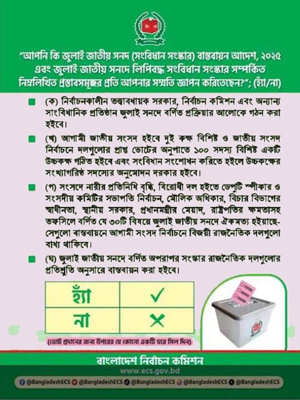 ‘আপনি কি জুলাই জাতীয় সনদ (সংবিধান সংশোধন) বাস্তবায়ন আদেশ, ২০২৫ এবং জুলাই জাতীয় সনদে নিম্নলিখিত সাংবিধানিক সংস্কার সম্পর্কিত নিম্নলিখিত প্রস্তাবসমূহের প্রতি আপনার সম্মতি জ্ঞাপন করিতেছেন?’ (হ্যাঁ/না)