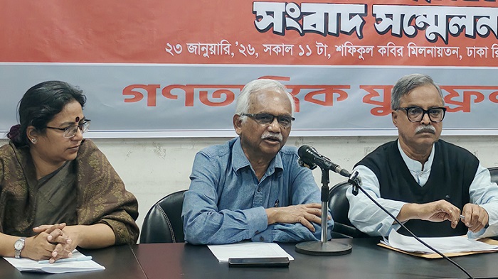 সংবাদ সম্মেলনে গণতান্ত্রিক যুক্তফ্রন্টের বিভিন্ন পর্যায়ের নেতাকর্মী ও সমর্থকরা উপস্থিত ছিলেন।