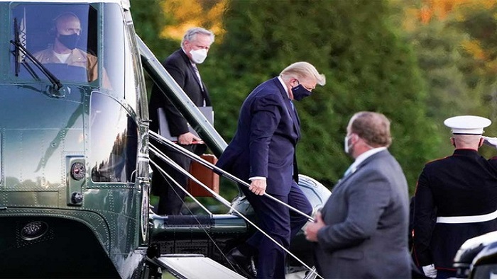 এর ১৭ ঘণ্টা পর প্রেসিডেন্টের হেলিকপ্টার ‘মেরিন ওয়ান’ এ করে হোয়াইট হাউজ থেকে হাসপাতালে যান ট্রাম্প।