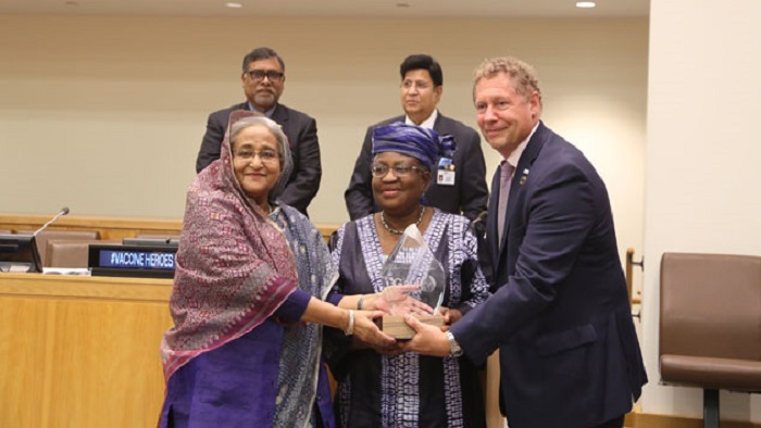 প্রধানমন্ত্রীর হাতে পুরস্কার তুলে দেন জিএভিআই বোর্ড সভাপতি ড. এনগোজি অকোনজো ইবিলা এবং সংস্থাটির প্রধান নির্বাহী কর্মকর্তা সেথ ফ্রাংকলিন বার্ক্লে।