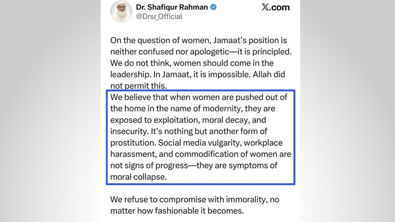 জামায়াত আমিরের ওই অ্যাকাউন্টে নারীদের সম্পর্কে ইংরেজিতে দেওয়া পোস্টের স্ক্রিনশট সামাজিক মাধ্যমে ভাইরাল হয়েছে। তাতে লেখা, “আমরা বিশ্বাস করি, আধুনিকতার নামে যখন নারীদের ঘরের বাইরে ঠেলে দেওয়া হয়, তখন তারা শোষণ, নৈতিক অবক্ষয় ও নিরাপত্তাহীনতার মুখে পড়ে। এটা আসলে পতিতাবৃত্তিরই আরেক রূপ।”
