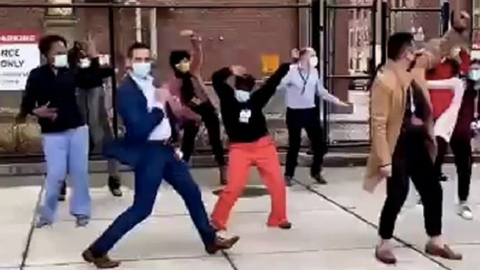 ভিডিও ফুটেজটি টুইট করেছেন হাসপাতালের প্রেসিডেন্ট ও সিইও কেট ওয়েলস। তাতে দেখা যাচ্ছে, মাস্ক পরে এবং সামাজিক দূরত্ব বজায় রেখে নিকটবর্তী ফুটপাতে নাচছেন স্বাস্থ্যকর্মীরা।
